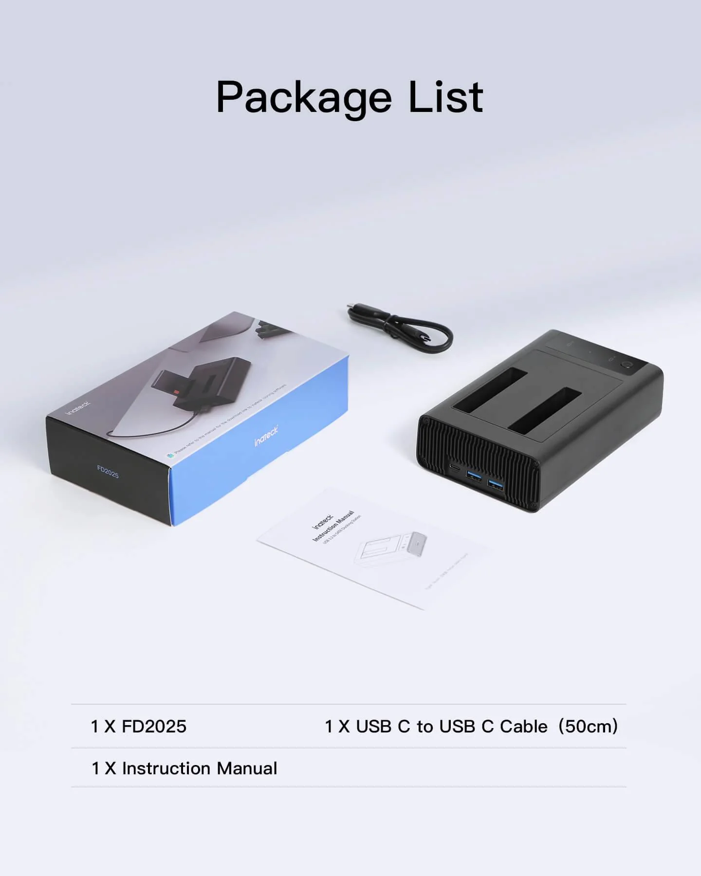 | Package contents | 1 × Dual-bay hard drive dock (FD2025) 1 × USB 3.2 Gen 2 data cable (USB-A to USB-C or USB-C to USB-C) |